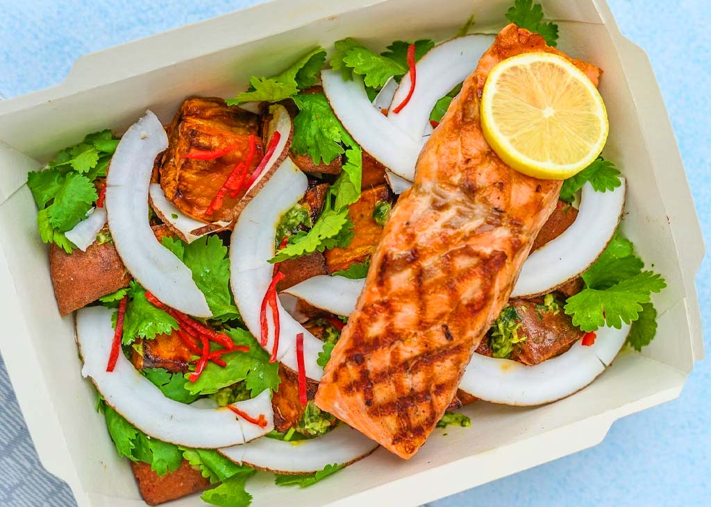 Cena: Salmón a la parrilla con quinoa y verduras al vapor.